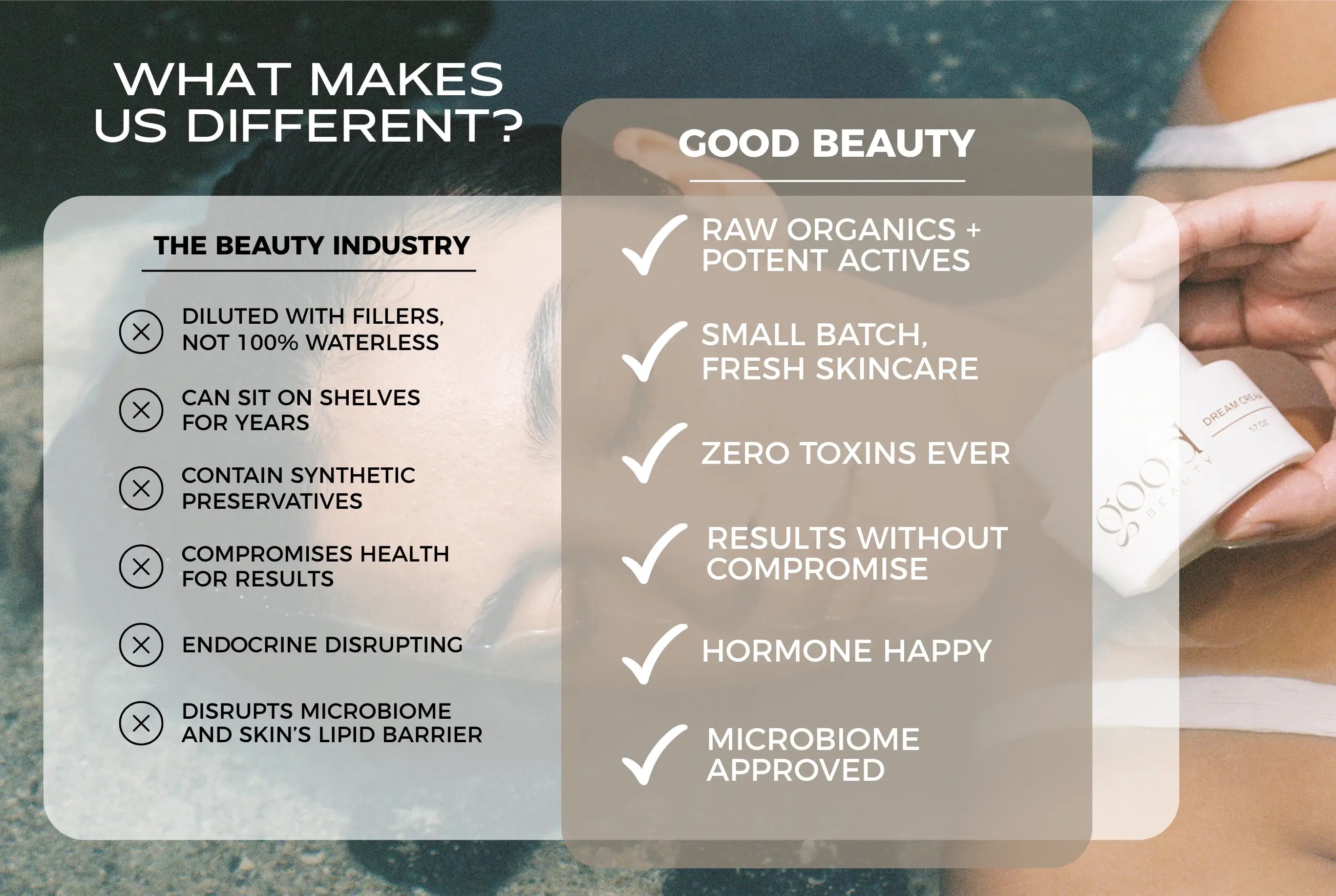 We are not just another "clean" brand—we’re truly clean and we are results-driven. Our formulas are 100% free of synthetic preservatives, endocrine disruptors, fillers and toxins. Good Beauty goes beyond waterless and combines raw, organic ingredients with modern dermal actives that work in harmony with your skin for visible, transformative results. All without a single compromise to your health. This is where Beauty meets Wellness.